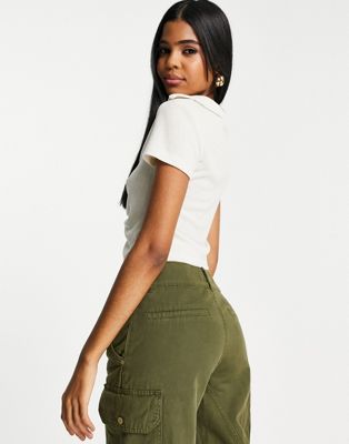 Shirt by Stradivarius Exclusive to ASOS Spread collar Button placket Ruched front Short sleeves Slim fit